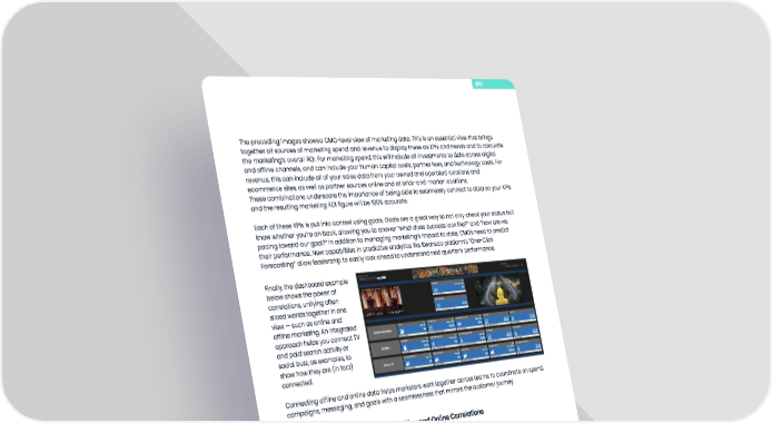 010 The preceding images showsa CMO-level view of marketing data. This is an essential view that brings together all sources of marketing spend and revenue to display these as KPIs and trends and to calculate the marketing’s overall ROI. For marketing spend, this will include all investments to date across digital and offline channels, and can include your human capital costs, partner fees, and technology costs. For revenue, this can include all of your sales data from your owned and operated locations and ecommerce sites, as well as partner sources online and at brick-and-mortar locations. These combinations underscore the importance of being able to seamlessly connect to data so your KPIs and the resulting marketing ROI figure will be 100% accurate. Each of these KPIs is put into context using goals. Goals are a great way to not only check your status but know whether you’re on track, allowing you to answer “what does success look like?” and “how are we pacing toward our goal?” In addition to managing marketing’s impact to date, CMOs need to predict their performance. New capabilities in predictive analytics like Kwanzoo platform’s “One-Click Forecasting” allow leadership to easily look ahead to understand next quarter’s performance. Finally, the dashboard example below shows the power of correlations, unifying often siloed worlds together in one view — such as online and offline marketing. An integrated approach helps you connect TV and paid search activity or social buzz, as examples, to show how they are (in fact) connected. Connecting offline and online data helps marketers work together across teams to coordinate on spend, campaigns, messaging, and goals with a seamlessness that mirrors the customer journey. Marketing Synergies View showing Offline and Online Correlations These are just several examples of the elevated views an integrated marketing analytics approach can give your organization, but there are many more. These extend to other parts of the customer journey as well as deeper levels of granularity such as the placement and creative levels. As you plan your strategy, consider for every stakeholder how a connected view of their data can help monitor, measure, and manage every marketing investment, performance, and outcome. If you need help connecting the dots, inquire about your solution provider’s implementation methodology. Kwanzoo’s Decision Lenses framework, for example, helps marketers plan out each view to ensure their deployment supports smarter decision-making from day one through a simple step-by-step process. Kwanzoo