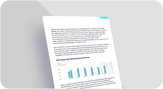 008 The preceding images showsa CMO-level view of marketing data. This is an essential view that brings together all sources of marketing spend and revenue to display these as KPIs and trends and to calculate the marketing’s overall ROI. For marketing spend, this will include all investments to date across digital and offline channels, and can include your human capital costs, partner fees, and technology costs. For revenue, this can include all of your sales data from your owned and operated locations and ecommerce sites, as well as partner sources online and at brick-and-mortar locations. These combinations underscore the importance of being able to seamlessly connect to data so your KPIs and the resulting marketing ROI figure will be 100% accurate. Each of these KPIs is put into context using goals. Goals are a great way to not only check your status but know whether you’re on track, allowing you to answer “what does success look like?” and “how are we pacing toward our goal?” In addition to managing marketing’s impact to date, CMOs need to predict their performance. New capabilities in predictive analytics like Kwanzoo platform’s “One-Click Forecasting” allow leadership to easily look ahead to understand next quarter’s performance. CMO Forecast View of Marketing Spend and Revenue Equally valuable is the ability to drill below the surface of KPIs and trends to see breakdowns by your key data dimensions, such as channel, product, region, and business unit. Using the power of data harmonization, an integrated marketing analytics approach allows these comparisons to be easily visualized to understand the key drivers (and detractors) of the top-line KPIs, such as these CMO views of investments and outcomes by channel and product. CMO Channel Analysis View of Marketing Investments and Sales by Product Kwanzoo