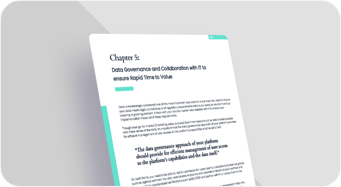012 Chapter 5: Data Governance and Collaboration with IT to ensure Rapid Time to Value Data is increasingly considered one of the most important resources for a business. You need to ensure your data meets legal, compliance, and regulatory requirements before you scale, so you don’t end up creating a growing problem. Check with your solution vendor and validate with IT to ensure your implementation meets all of these requirements. Though your go-to-market (marketing, sales, success) team members should be able to easily access and make sense of the data, it’s important that the data governance approach of your platform provides for efficient management of user access to the platform’s capabilities and the data itself. “T“The dahe data gota govveernance apprrnance approach of yoach of your plaour platfotform rm should prshould proovide fovide for efficier efficiennt managemet managemennt of uset of user access r access to the plato the platfotform’s capabilities and the darm’s capabilities and the data itself.” ta itself.” On both fronts, you need to be able to restrict permission for users, teams, and potentially external groups such as agency partners. You also need to ensure your solution provider’s infrastructure is certified and secure. Look for standardized certifications such asISO 27001 and partner with IT to include them in the vetting process. Do your marketing leaders work with IT leaders? Based on the stakeholders you assembled in step one, kick-start these relationships to let both parties know they will be working together in some capacity. Staying aware of what tools are in use, and the utilization of these tools, is not only useful for data integration but also for identifying who needs access to what data. Key questions to answer Who should have access to the platform’s capabilities for data integration, harmonization, KPI creation, dashboarding building, and dashboard viewing within your organization? Are there security restrictions by stakeholders either at the source level or the row level (for example, a metric within a data source)? Is there specific data that only specific stakeholders can have access to? Are there specific data sets that partners can only have access to? Does your vendor partner’s data security meet your company’s user access and data security requirements? Are there security enablers you can leverage in your deployment, such as single sign-on (SSO)? Do your marketing leaders already work closely with your IT leaders? Kwanzoo