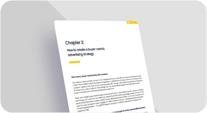 004 Chapter 2: How to create a buyer-centric advertising strategy Start every buyer relationship with consent. As a result of nearly endless choices in the marketplace today, customers are more demanding than ever. In fact, 72% of today’s customers expect companies to understand their needs. That’s why it’s crucial to put customer needs at the center of your business goals. With enough unified data, the right data architecture and taxonomy, and a customer-first mindset, you can create advertising journeys that relate to each buyer’s interests and build trusting relationships over time. When each target buyer, and their associated account has a unified identity across all of your marketing technology, you’ll have the information you need to build B2B marketing strategies based on their (or their persona’s) preferences on every channel. Plus, by delivering relevant content on the right channels at the right time, you can gather buyer engagement data to inform both your marketing programs and sales outreach going forward — it’s a gift that keeps on giving for marketers, sales teams, prospects and customers alike. Think through the best experience for each target buyer & create a personalized journey. Treating each target account, and buyers at that account as an individual is essential. It’s important to be able to deliver different offers and messaging to unique audiences based on their needs. With B2B marketing, it may not always be possible to personalize at the individual buyer level. It can then be very beneficial to personalize to each of the key target buyer personas (e.g. VP of Marketing, CFO, Sales Managers). Through a B2B GTM platform, that is combined with a data lake or customer data platform (CDP), that easily connects into third party marketing and sales data sources, marketers can use data to identify key traits about both prospects and existing buyers at their target accounts. Marketers can use that information to generate target account lists that match their ideal account profile(s) (IAP) for each line-of-business (LOB) within their Company. They can then focus on the right set of prioritized accounts and key target personas for tailored B2B advertising. Targeting accounts and B2B buyers or specific personas (a group of buyers with similar expectations around specific products or solutions) on a 1-to-1 basis is a foundational part of delivering the best experiences to each prospect and customer. With a full understanding of each customer’s interests and past interactions, you can improve experiences by personalizing all of your future interactions specifically to what those prospects and customers want. Kwanzoo