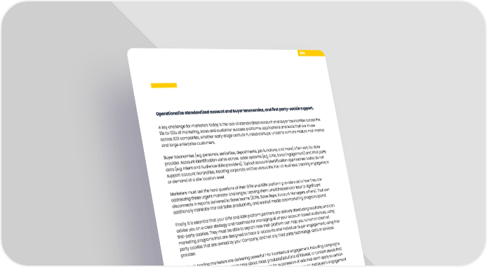 005 Operationalize standardized account and buyer taxonomies, and first party-cookie support. A key challenge for marketers today is the lack of standardized account and buyer taxonomies across the 10s to 100s of marketing, sales and customer success platforms, applications and tools that are in use across B2B companies, whether early stage venture-funded startups, unicorns or more mature mid-market and large enterprise customers. Buyer taxonomies (e.g. personas, seniorities, departments, job functions, and more) often vary by data provider. Account identification varies across sales systems (e.g. CRM, Sales Engagement) and third party data (e.g. Intent and Audience data providers). Typical account identification approaches today do not support account hierarchies, tracking corporate entities versus the line-of-business, tracking engagement or demand at a site location level. Marketers must ask the hard questions of their GTM and ABM platform providers as to how they are addressing these urgent marketer challenges. Leaving them unaddressed can lead to significant disconnects in reports delivered to Sales teams (SDRs, Sales Reps, Account Managers, others). That can additionally translate into lost Sales productivity, and wasted media and marketing program spend. Finally, it is essential that your GTM and ABM platform partners are actively developing solutions, and can advise you on a clear strategy and roadmap for managing all of your account-based audiences, using first-party cookies. They must be able to explain how their platform can help you run omni-channel marketing programs that are designed to track all accounts and individual buyer engagement, using first- party cookies that are owned by your Company, and not any third party technology, data or services provider. Today’s leading marketers are delivering powerful 1-to-1 contextual engagement, including campaigns personalized to topics customers care about most, products/solutions of interest, or content assets that speak to their specific persona. They additionally plan for suppression of ads that don’t apply to certain accounts or target buyers — all based on a unified view of each target account and buyer’s engagement history with the brand. Consider your next steps. Remember, personalized advertising and target account and buyer engagement isn’t just about single moments of connection. It’s really about creating experiences across their buyer journey that shifts, moves, and evolves based on who the account is, the relevant personas at that account, the content they interact with, and what they’re interested in. To truly drive growth with data-driven advertising, you need to have a clear plan for what your next steps are right from the very first buyer interaction at any of your ideal account profile (IAP) accounts. Consider how that first engagement can be a jumping-off point for future interactions and an overall journey personalized to each target persona and buyer. Kwanzoo
